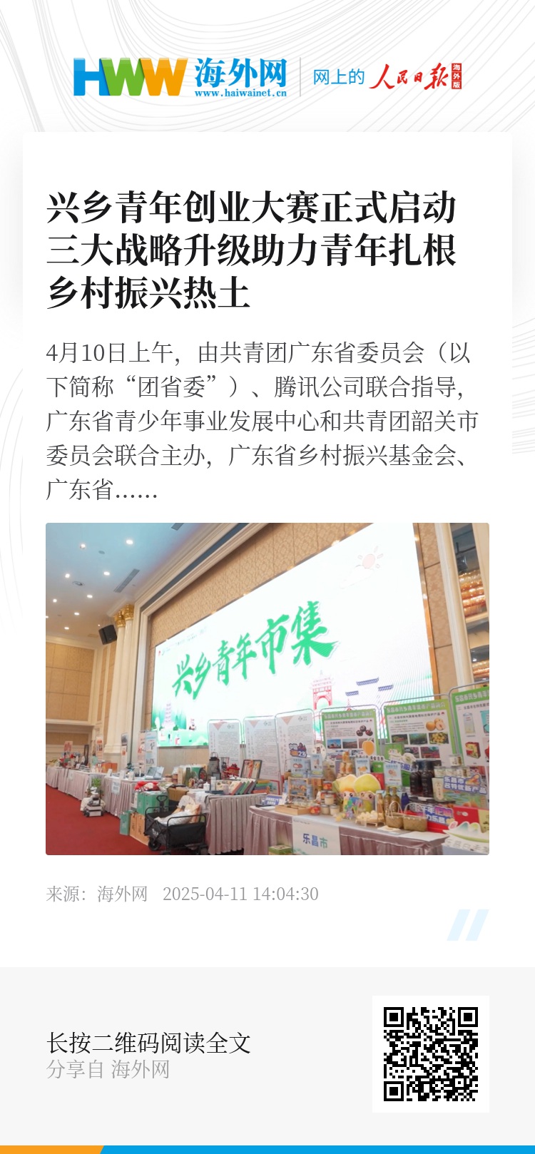 据悉,2023年12月,团省委、腾讯公司和中国农业大学共同发起广东“百千万工程”青年兴乡培育计划,为返乡兴乡青年提供系统性培训和创业项目孵化支持。为进一步夯实培育计划成果,2024年11月至12月,“创青春”广东“百千万工程”兴乡青年创业大赛举办,15名选手晋级决赛。主办方聚焦15个决赛项目,制作兴乡青年真人秀《闪亮的青村》,真人秀在腾讯新闻平台播放量超千万次。15位广东青年,通过兴乡青年创业大赛获得430万元资助。
