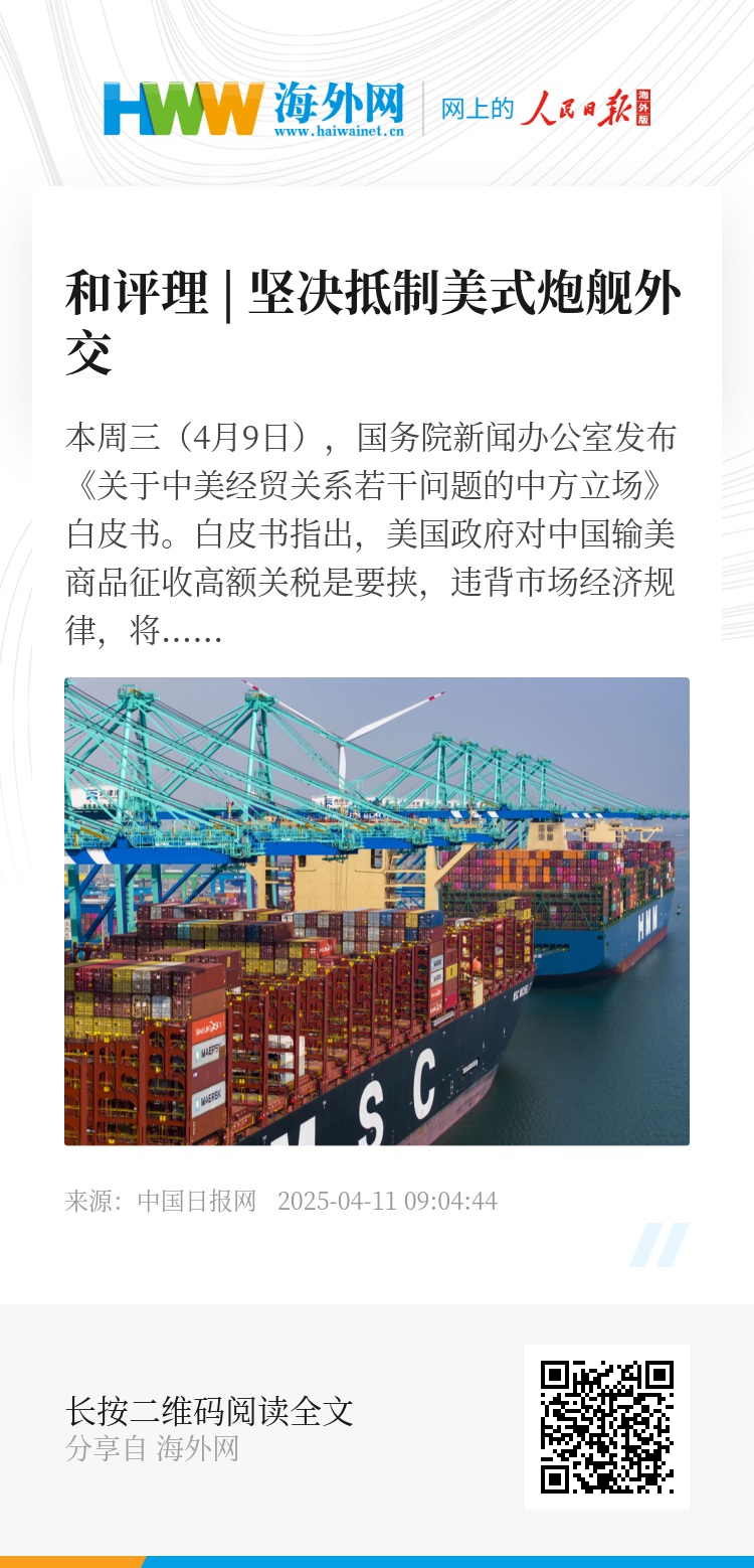 美国政府的关税胁迫是在玩弄强权,方向错误,只会走入死胡同。从历史上看,贸易战、关税战没有赢家,本质上不会对任何一方有利。美国滥用关税,侵犯了中国及其他国家的正当权益,且违反世界贸易组织规则,破坏以规则为基础的多边贸易体制,冲击全球经济秩序稳定。