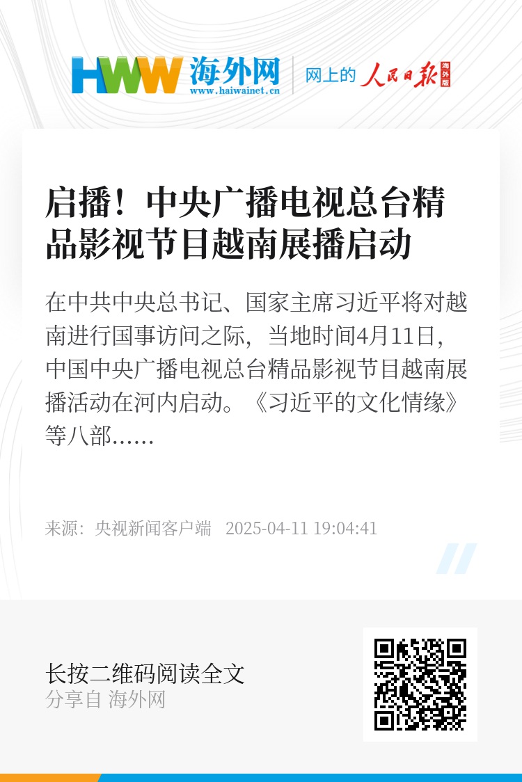在中共中央总书记、国家主席习近平将对越南进行国事访问之际,当地时间4月11日,中国中央广播电视总台精品影视节目越南展播活动在河内启动。《习近平的文化情缘》等八部总台精品影视节目将在越南主流媒体陆续播出。