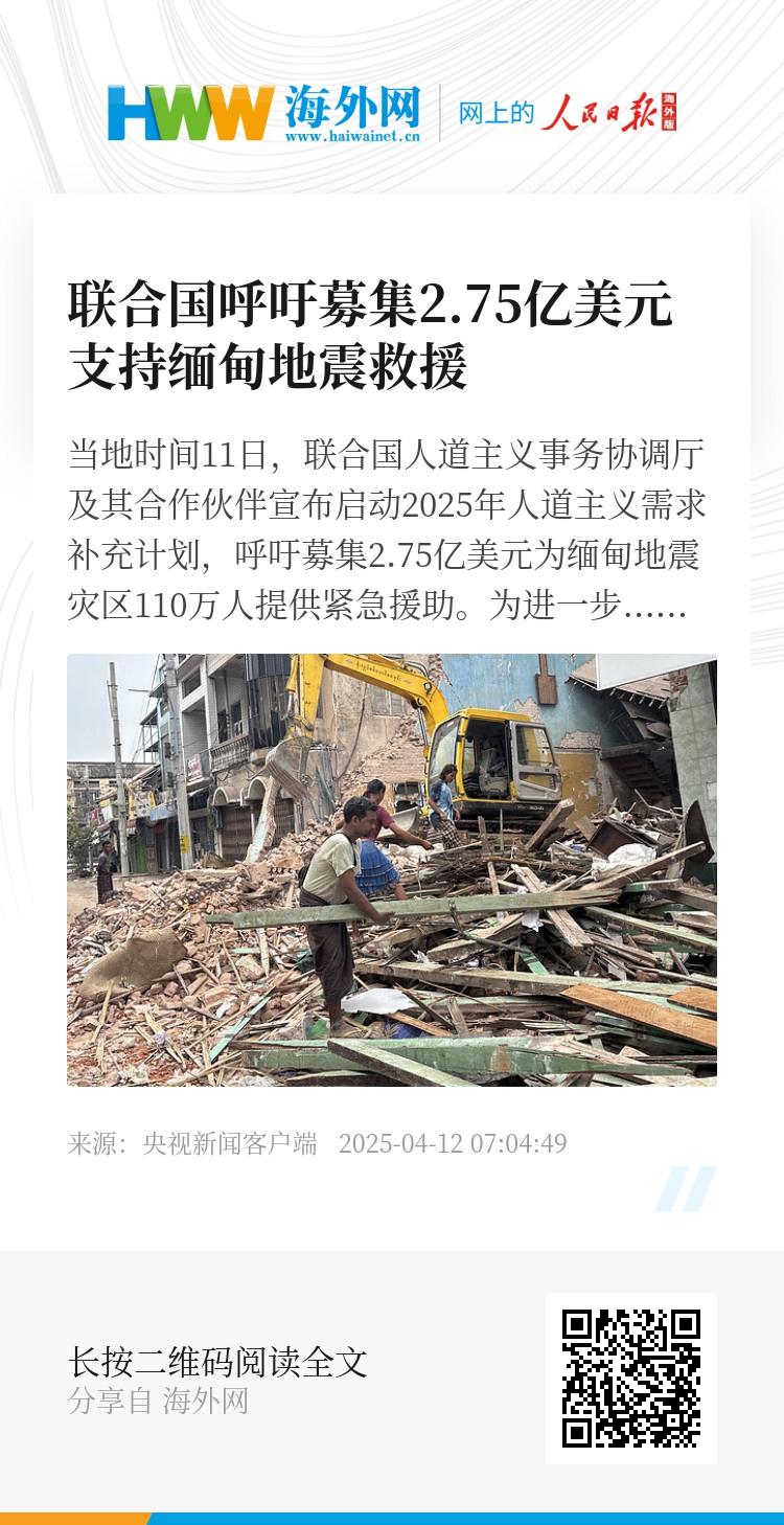 当地时间11日,联合国人道主义事务协调厅及其合作伙伴宣布启动2025年人道主义需求补充计划,呼吁募集2.75亿美元为缅甸地震灾区110万人提供紧急援助。