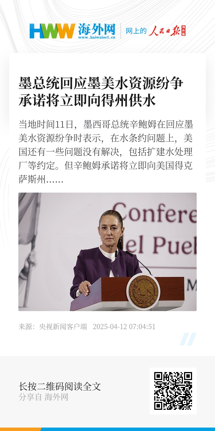 当地时间11日,墨西哥总统辛鲍姆在回应墨美水资源纷争时表示,在水条约问题上,美国还有一些问题没有解决,包括扩建水处理厂等约定。但辛鲍姆承诺将立即向美国得克萨斯州农民供水。(总台记者 马天静)
