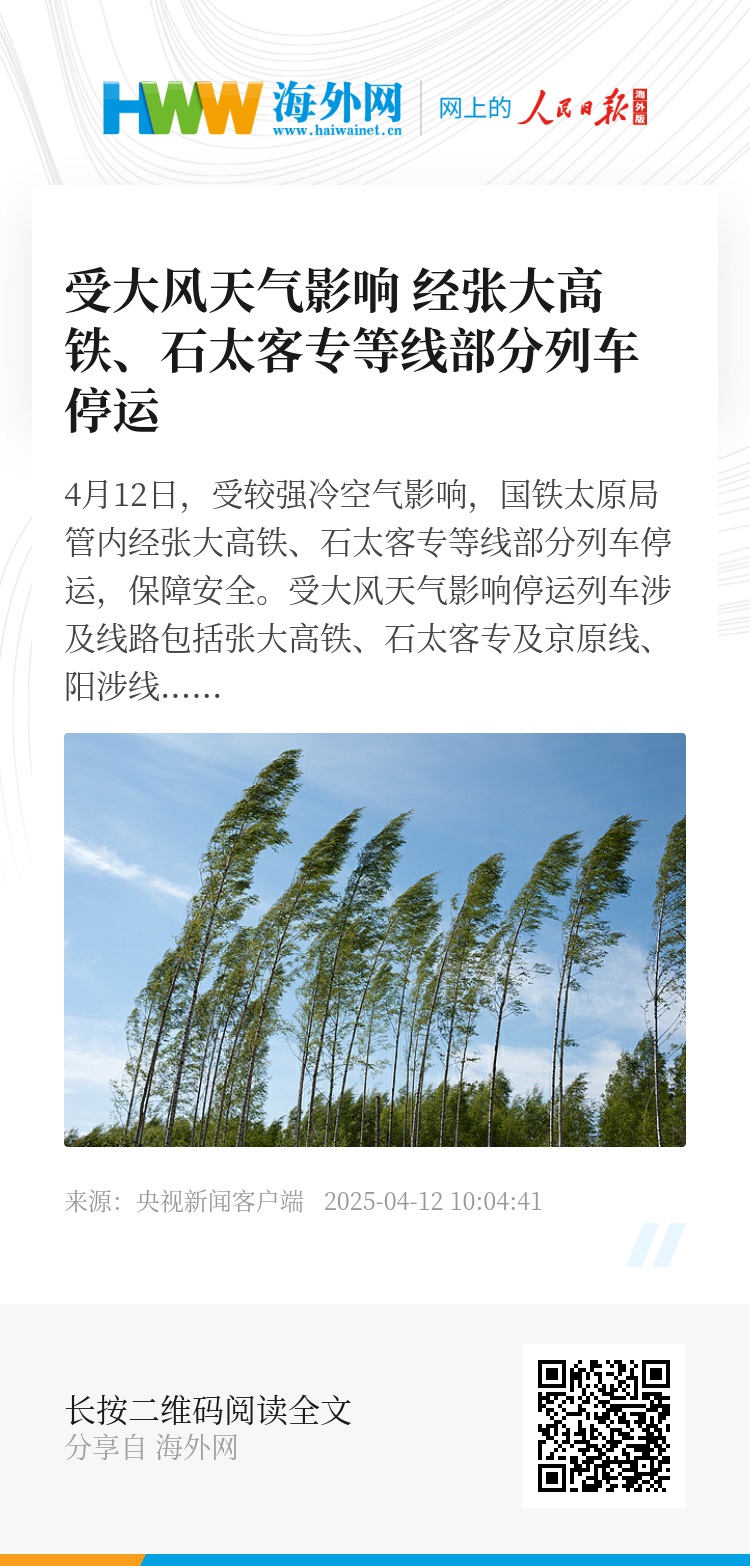 4月12日,受较强冷空气影响,国铁太原局管内经张大高铁、石太客专等线部分列车停运,保障安全。