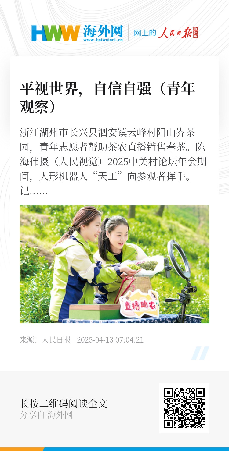 2024年8月,第三十三届夏季奥运会中国体育代表团成员郑钦文在接受媒体采访时,面对镜头自信地说:“我觉得年轻一代平视世界,就同时代表了中国的进步,只有去平视这个世界,你才能把真正的自己、完整的自己更强地发挥出来……”