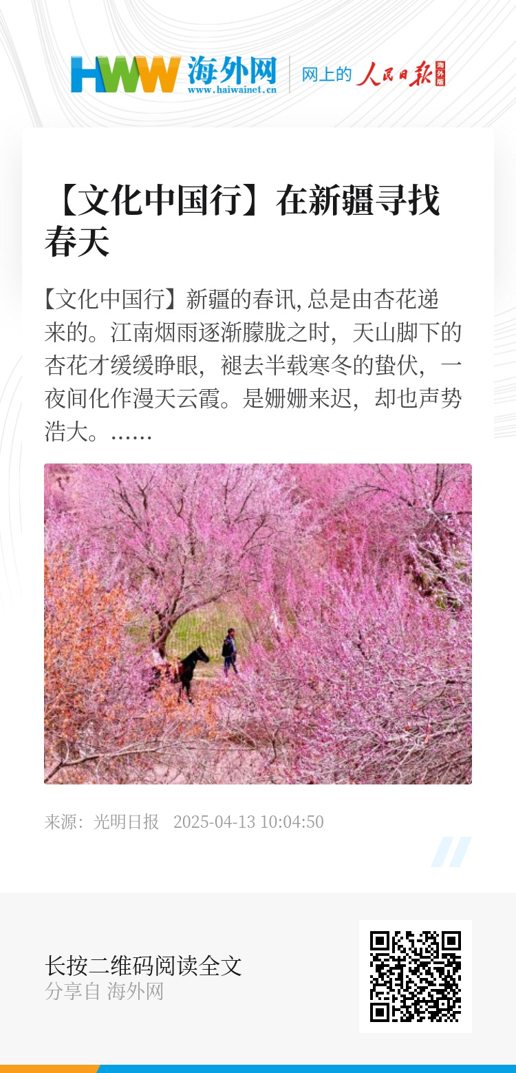 春如铁马,纵驰山海。当夕阳为杏林镀上金边,古老丝路正以花为媒,谱写新的“春日叙事”。杏花,在自然馈赠下逐渐完成从“观赏”到“深耕”的华丽转身。花开不是终点,而是万物生长的起点,春天不仅装点山河,更滋养每一个在阳光下牵手、欢歌、绽放如花的人。花瓣终会随风飘向天山之巅,但热辣滚烫的人间烟火永不落幕。(光明日报记者 孙金行 赵明昊 靳昊)