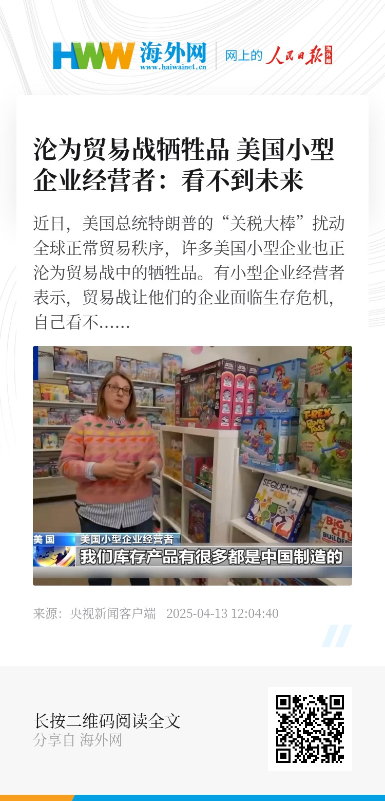 美国小型企业经营者:这不是简单说一句话的事情,“我们不从这个国家进货了”“我们去另一个国家进货”,尤其是这个国家是中国的情况下,我们库存产品有很多都是中国制造的。