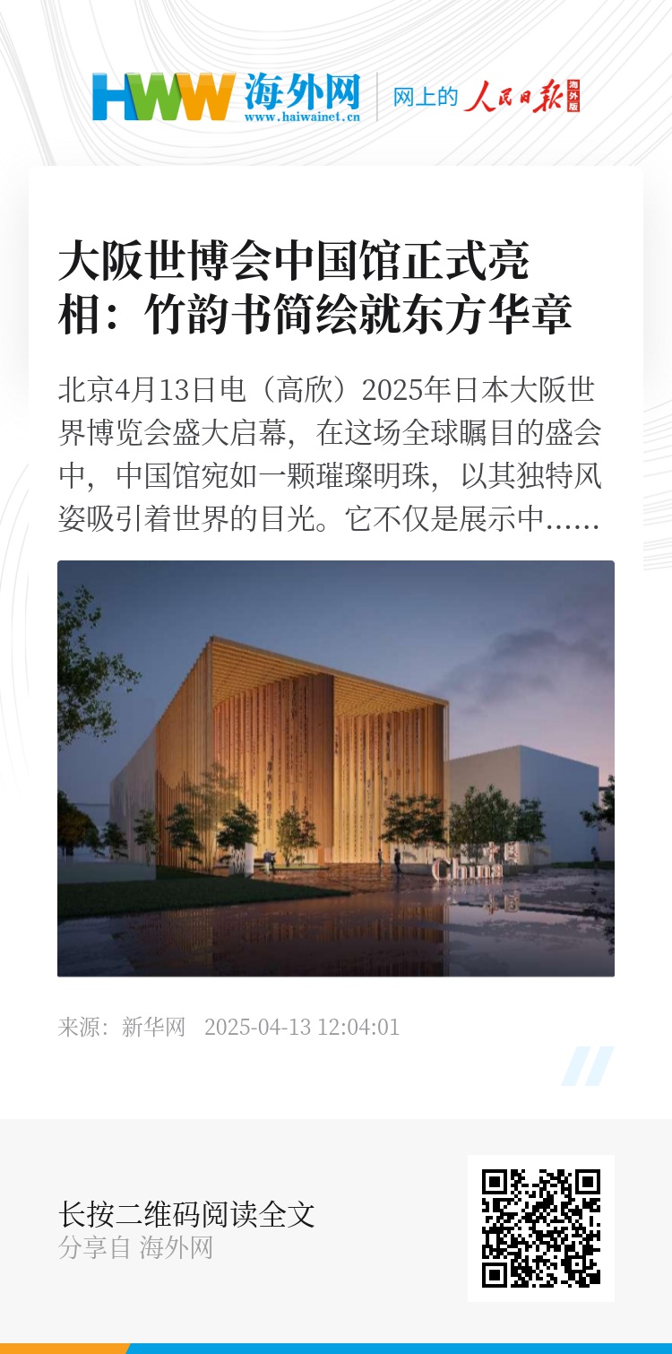 日本大阪世界博览会于2025年4月13日至10月13日举办,其中中国馆占地3500平方米,是世博会占地面积最大的外国自建馆之一。中国馆建筑设计以“中华书简”为灵感,由中国工程院院士、中国建科首席科学家、中国建筑设计研究院总建筑师崔愷提出概念方案,巧妙融合竹子、汉字、书卷等寓意丰富的文化符号,将竹简这个古老的信息传递工具,与当今信息时代的发展结合起来,诉说中华千年历史,展现中国生态文明建设,也诠释了“共同构建人与自然生命共同体——绿色发展的未来社会”的参展主题。