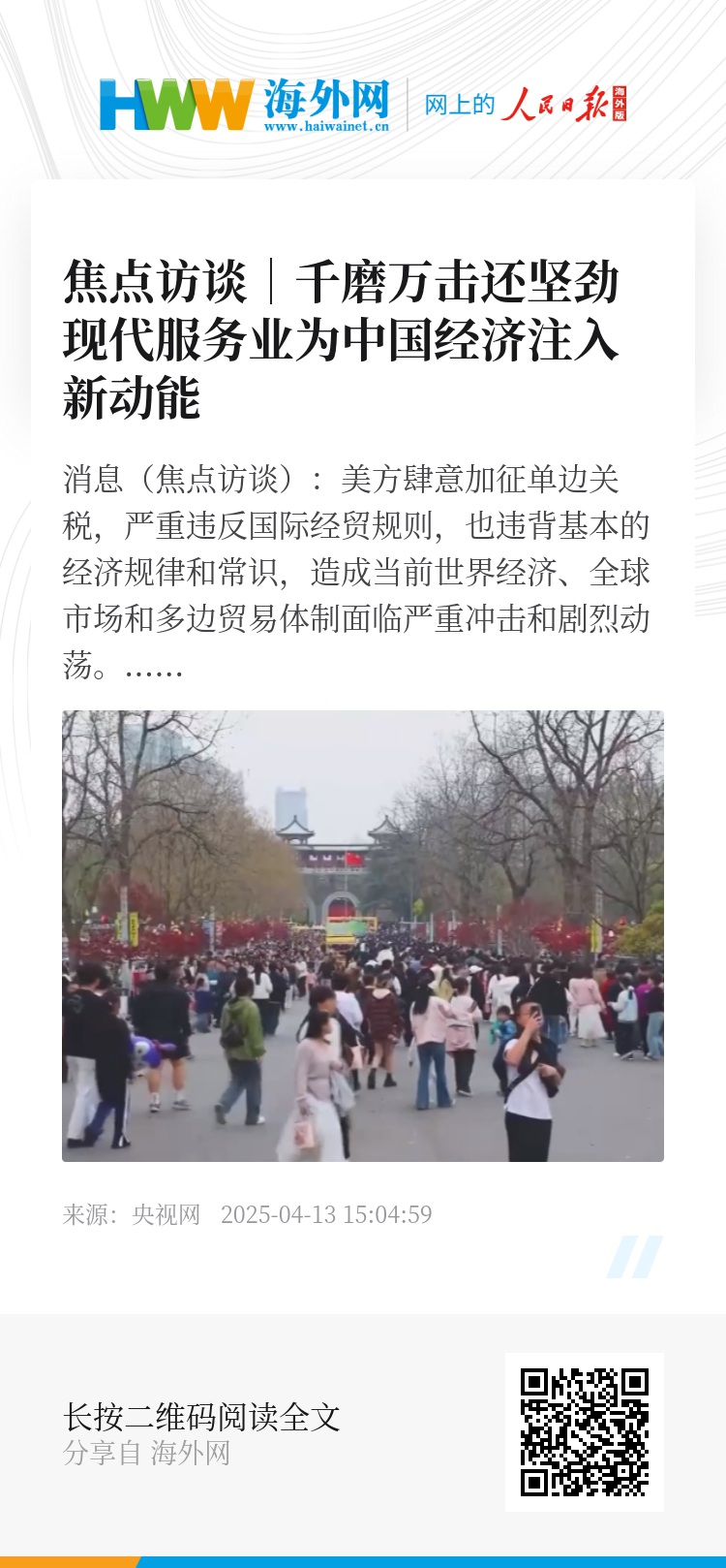 “千磨万击还坚劲,任尔东西南北风。”无论外部环境如何风云变幻,坚定不移地办好自己的事,是我们的基本态度。中国拥有全球规模最为庞大的中等收入群体。这一群体持续释放的消费潜力,正源源不断地将“中国需求”转化为“世界机遇”。面对美国发起的“关税战”,加快构建国内统一大市场、全方位扩大国内需求,是我们破局的关键之举。秉持新发展理念,我国的现代服务业在自身加速发展升级的同时,更赋能制造业等产业,不仅助力于扩大内需,也为抵御外部冲击增添了一份从容底气。