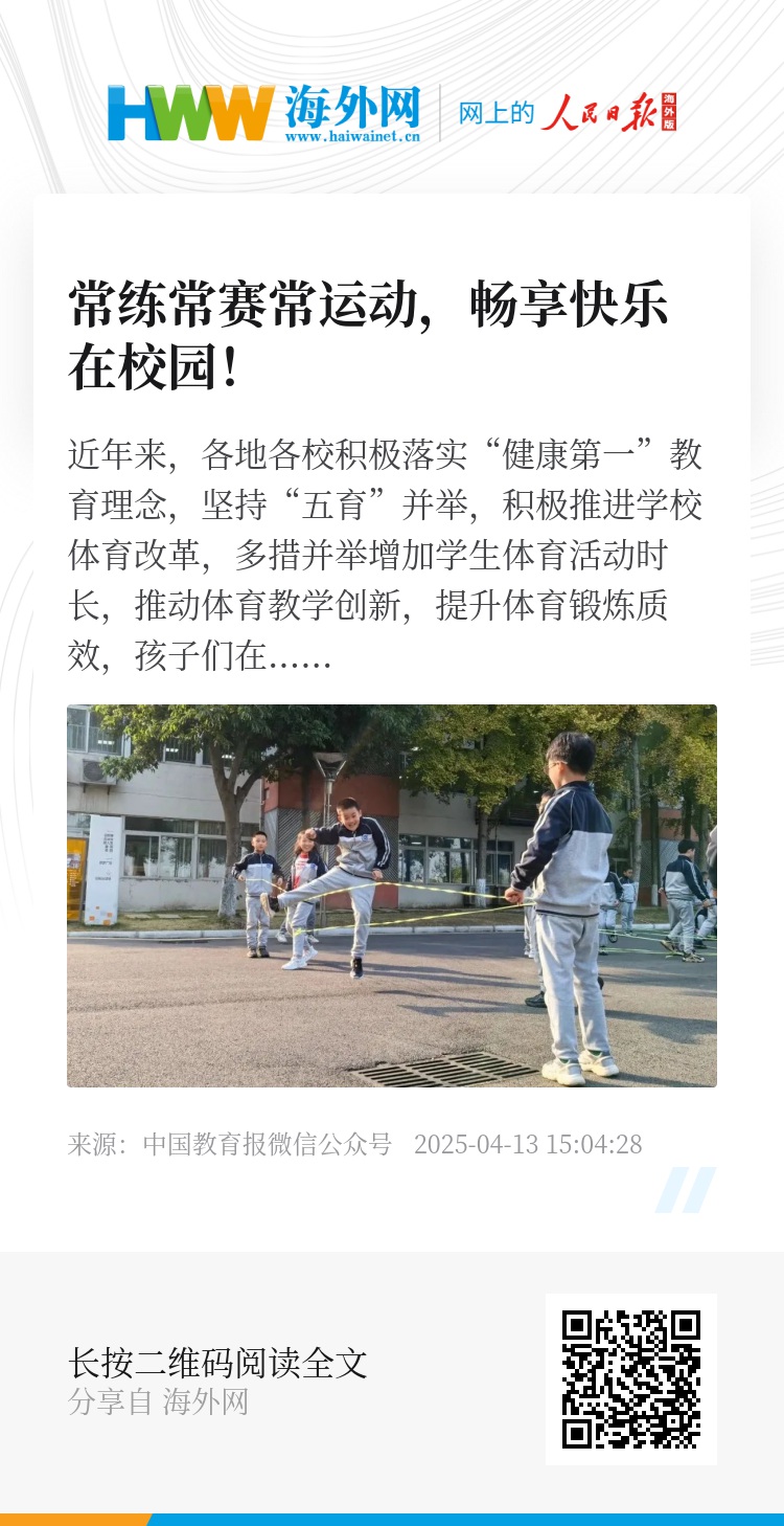 本文来源|中国教育报,原标题《四川多维度入手细化学校体育工作,助力学生健康成长 常练常赛常运动 畅享快乐在校园》《吉林深入实施“百万青少年上冰雪”行动 校园冰雪运动打造育人新引擎》《上海坚持面向人人,持续深化学校体育课改革——让更多学生享受运动快乐》《湖南全面加强中小学生全员文体活动——人人都上场 校校焕活力》