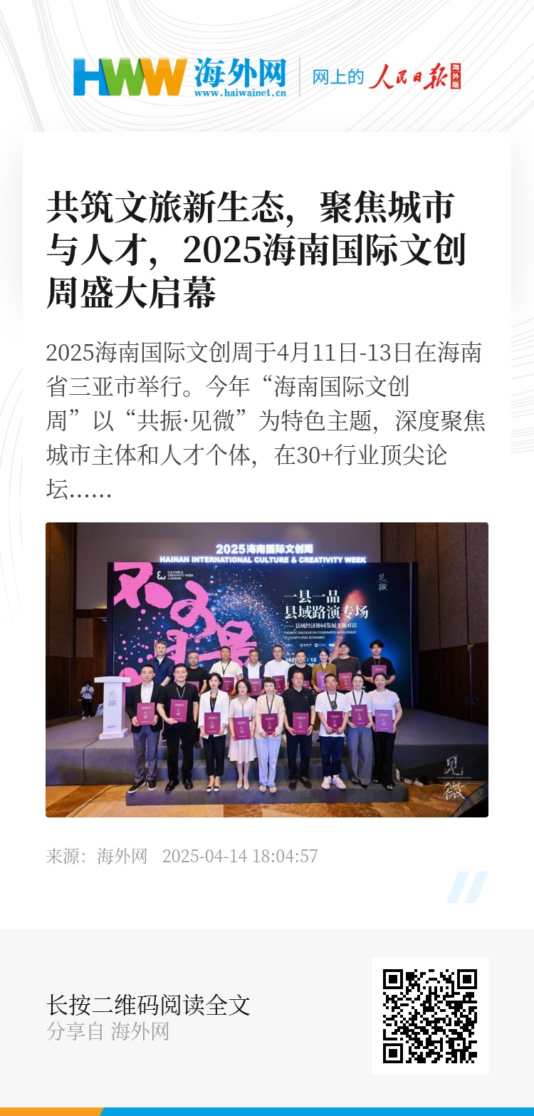 2025海南国际文创周于4月11日-13日在海南省三亚市举行。今年“海南国际文创周”以“共振·见微”为特色主题,深度聚焦城市主体和人才个体,在30+行业顶尖论坛和传统颁奖典礼(雪鹿奖、文创地图榜单、城市更新地图榜单、乡创地图榜单、产教融合地图榜单)之外,还增设了【中国超级旅游城市联赛】、【文旅职通车】等创新板块,规模空前。历届海南国际文创周的主题从“共振”、“重启”、“共生”、“燎原”再到“破浪”,陆续完成了对泛文旅产业生态的架构与聚集,积淀产业数字化、文化+旅游、乡村振兴、城市更新、县域转型等诸多热点议题,涉及商业、艺术、互联网、投融资等三十多个领域,将200+政府代表团、300+行业领袖以及1000+文旅企业一站式集成在各方参与者面前,已成为亚洲规模最大、覆盖面最广、前沿性最强的文旅商领域头部行业盛会。