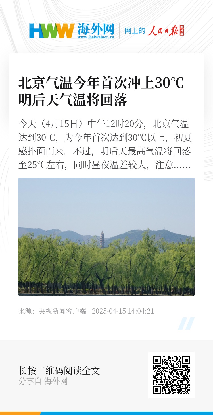 今天(4月15日)中午12时20分,北京气温达到30℃,为今年首次达到30℃以上,初夏感扑面而来。不过,明后天最高气温将回落至25℃左右,同时昼夜温差较大,注意根据气温变化及时添衣。