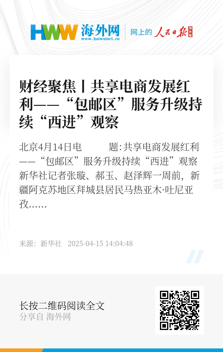 新华社北京4月14日电 题:共享电商发展红利——“包邮区”服务升级持续“西进”观察