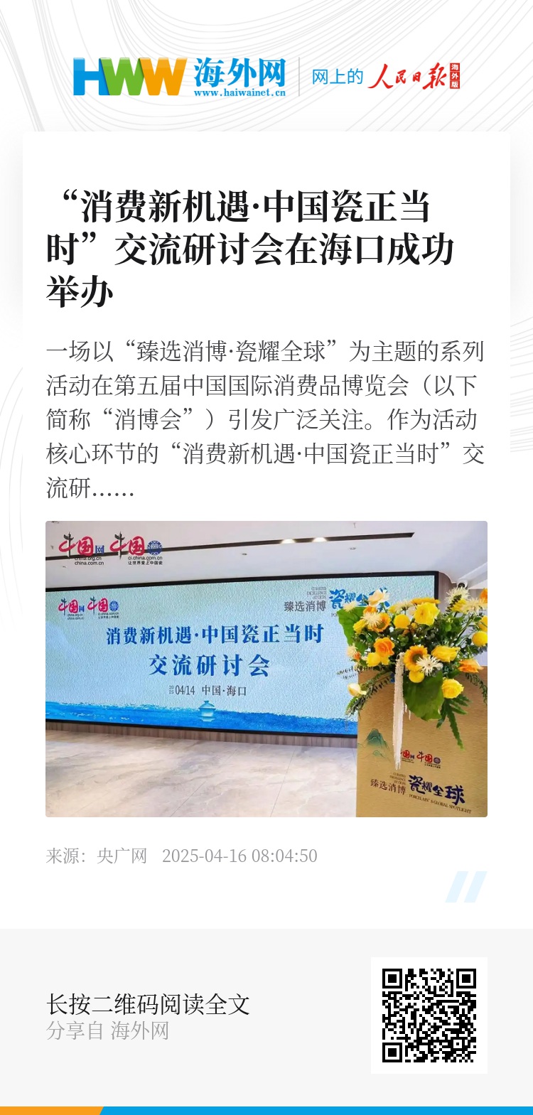 一场以“臻选消博·瓷耀全球”为主题的系列活动在第五届中国国际消费品博览会(以下简称“消博会”)引发广泛关注。作为活动核心环节的“消费新机遇·中国瓷正当时”交流研讨会,于4月14日在中国网中国瓷(自贸港)文化体验中心成功举办。