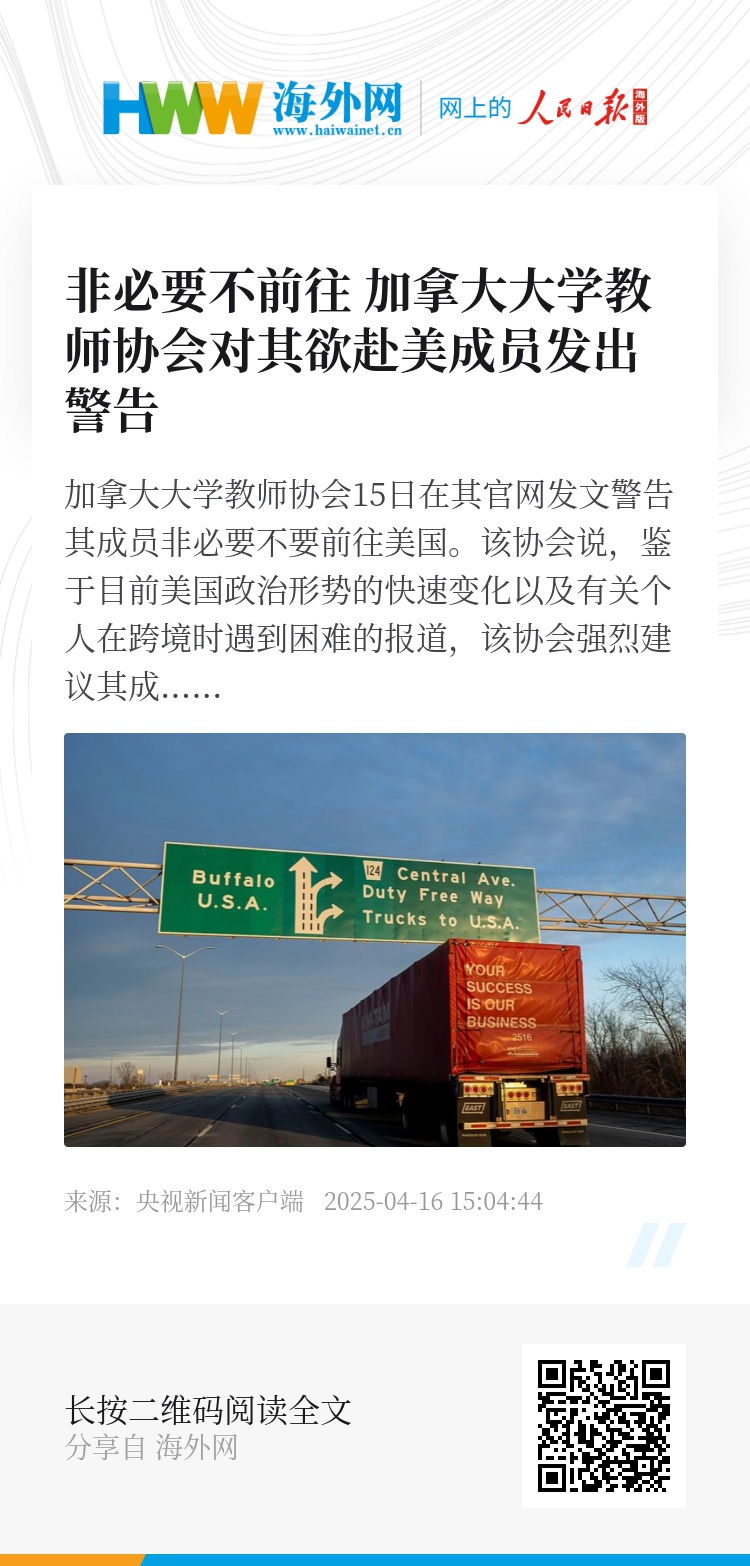 加拿大大学教师协会15日在其官网发文警告其成员非必要不要前往美国。