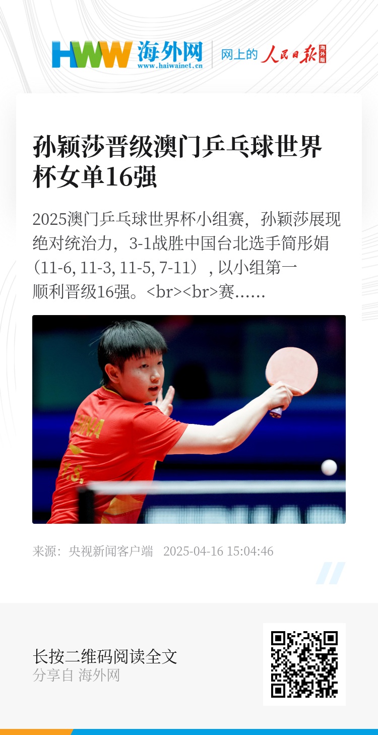 2025澳门乒乓球世界杯小组赛,孙颖莎展现绝对统治力,3-1战胜中国台北选手简彤娟(11-6,11-3,11-5,7-11) ,以小组第一顺利晋级16强。