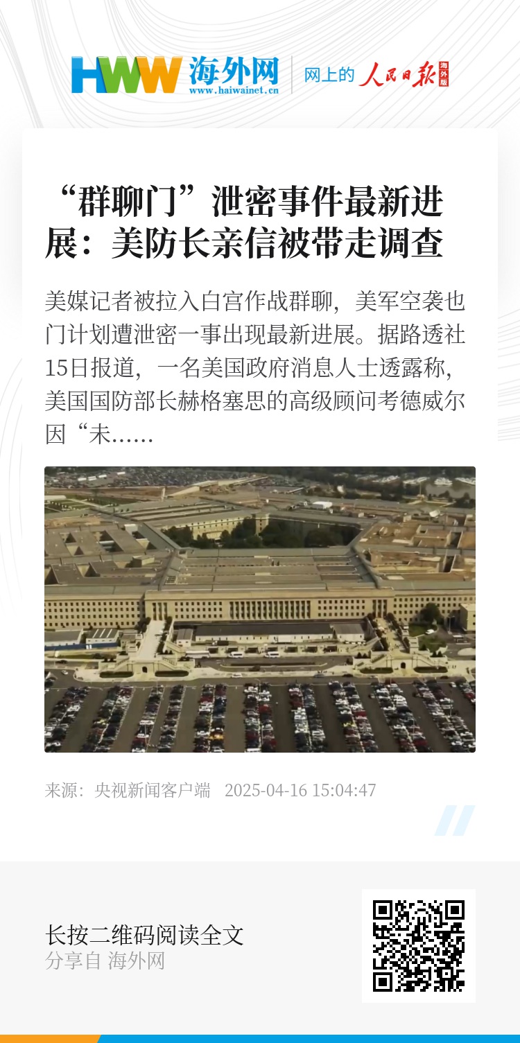 另据美国《政治报》15日报道,另一名美国国防部高层官员塞尔尼克也在泄密调查中被停职,同样也被带离五角大楼。