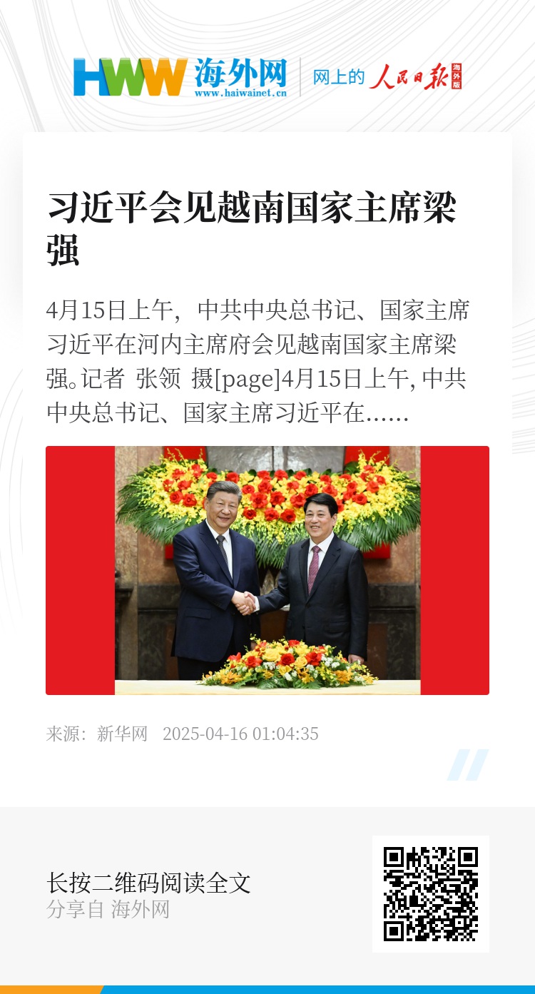 4月15日上午,中共中央总书记、国家主席习近平在河内主席府会见越南国家主席梁强。