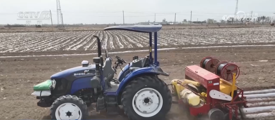 目前,当地正在进行翻耕土地、覆膜等作业,为后续的玉米种植提供有力基础条件。在技术人员设定参数后,搭载北斗导航系统的无人驾驶播种机按规划路线灵活地转弯、掉头,机身配备的智能传感器可以实时监测土壤湿度、种子间距等关键数据。传统覆膜、播种作业需要3人配合,每天作业量是15亩;现在,一台兼具覆膜功能的机械一天就能完成60亩。