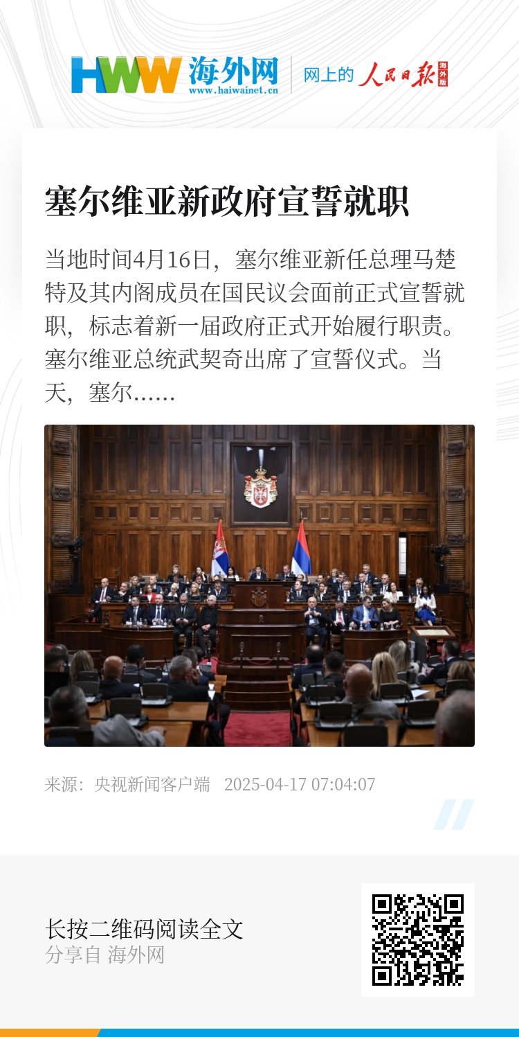 当天,塞尔维亚议会表决通过新一届政府,由马楚特出任总理。新一届政府共由31人组成,包括30位部长和1位总理。(总台记者 张颖)