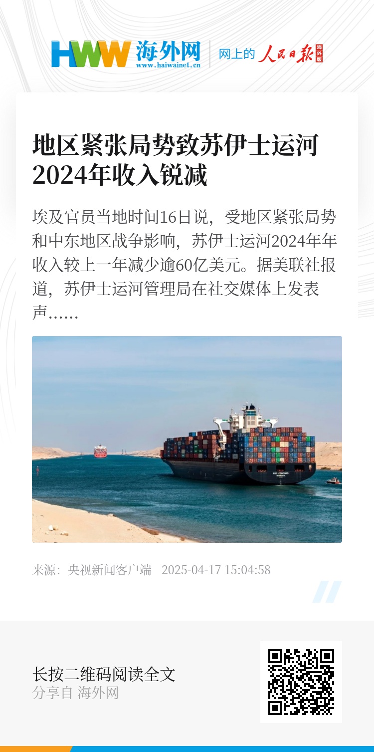 埃及官员当地时间16日说,受地区紧张局势和中东地区战争影响,苏伊士运河2024年年收入较上一年减少逾60亿美元。