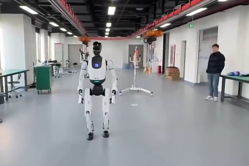 总台记者 袁嘉忆:我现在是在北京人形机器人创新中心,与我并肩而立的这位就是参加这次北京亦庄人形机器人半程马拉松的“天工”,我们看它一米八的大个子很是魁梧,不过它跑起来的表现是怎么样呢?我们现场简单地操练一下。