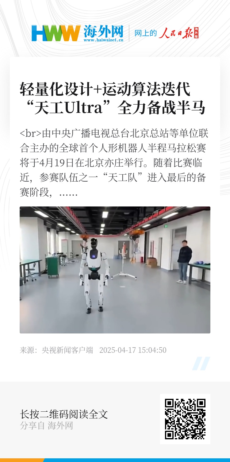 由中央广播电视总台北京总站等单位联合主办的全球首个人形机器人半程马拉松赛将于4月19日在北京亦庄举行。随着比赛临近,参赛队伍之一“天工队”进入最后的备赛阶段,赛前机器人“天工Ultra”的状态怎么样?总台记者前往“天工”的家进行了独家探访。