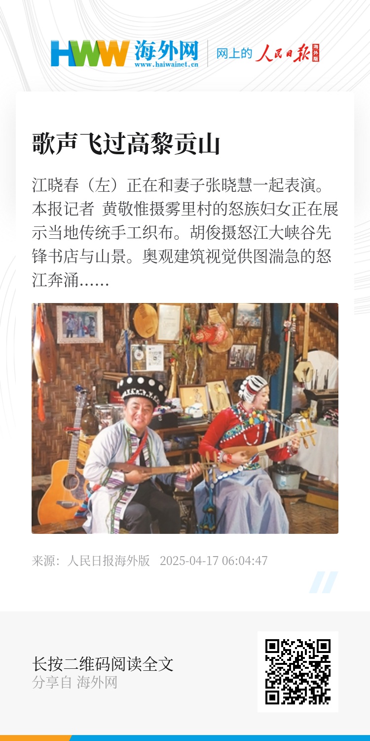 “怒族人起名遵循‘父子联名制’,父辈的名是下一辈的姓。我们的家谱就是一部民族迁徙史,接龙一般的名字中蕴含着很多古老传说……”在云南省怒江傈僳族自治州福贡县老姆登村“江家小院音乐工坊”里,怒族音乐人江晓春和傈僳族妻子张晓慧一边弹达比亚(一种乐器)、吹几味(竹口琴),一边向观众介绍当地富有民族特色的历史文化。