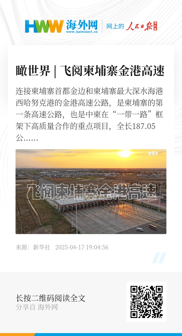 连接柬埔寨首都金边和柬埔寨最大深水海港西哈努克港的金港高速公路,是柬埔寨的第一条高速公路,也是中柬在“一带一路”框架下高质量合作的重点项目,全长187.05公里,双向四车道。