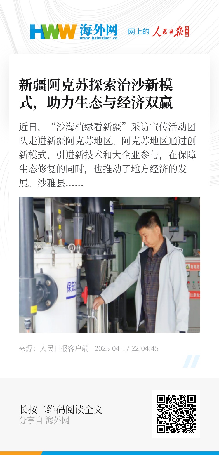 通过这一系列创新举措,阿克苏地区不仅有效治沙,还推动了当地经济的多元化发展,提高居民的生活水平,实现了生态保护与经济发展的相互促进。(实习生 马雯萱)