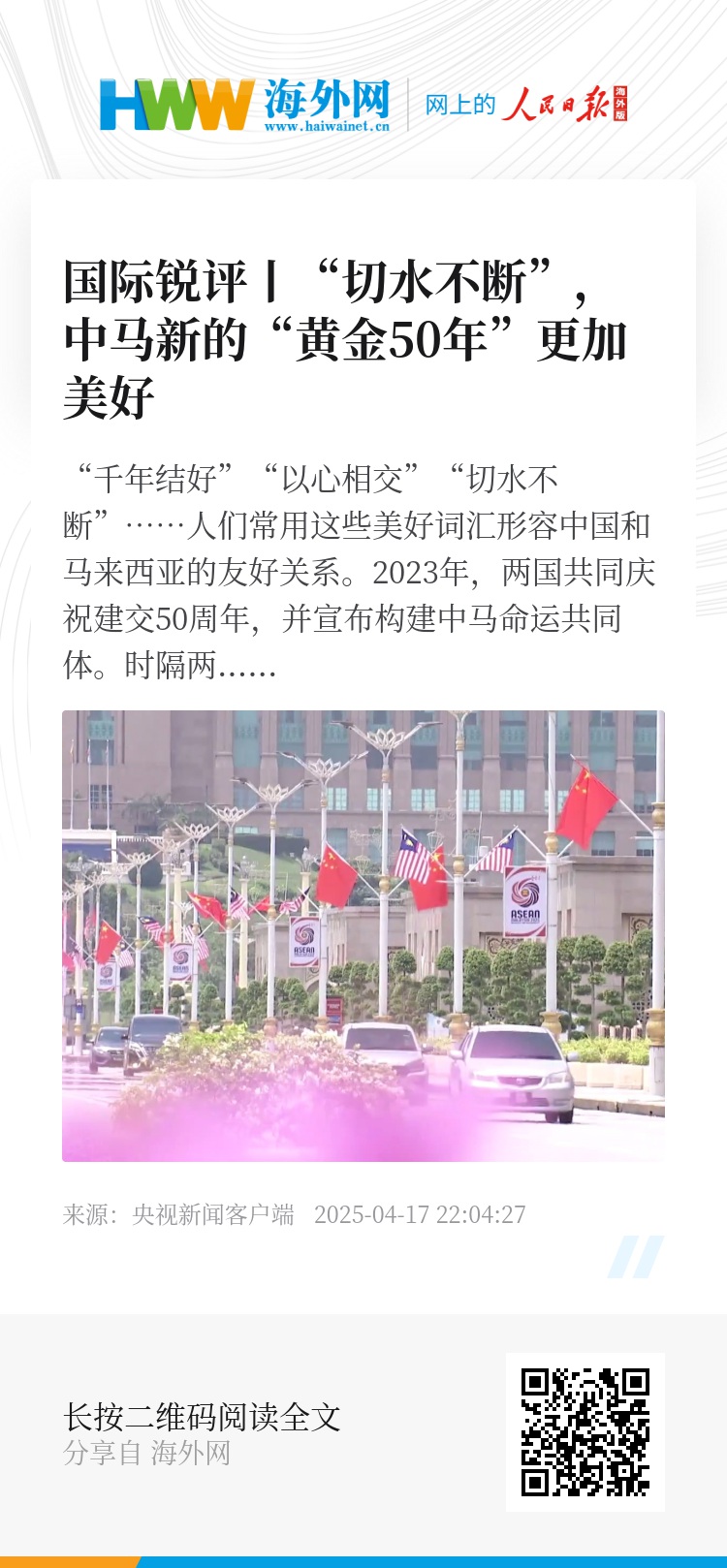 “千年结好”“以心相交”“切水不断”……人们常用这些美好词汇形容中国和马来西亚的友好关系。2023年,两国共同庆祝建交50周年,并宣布构建中马命运共同体。时隔两年,双边关系迎来提质升级。中国国家主席习近平15日至17日对马来西亚进行国事访问,双方一致同意构建高水平战略性中马命运共同体,打造中马关系新的“黄金50年”。