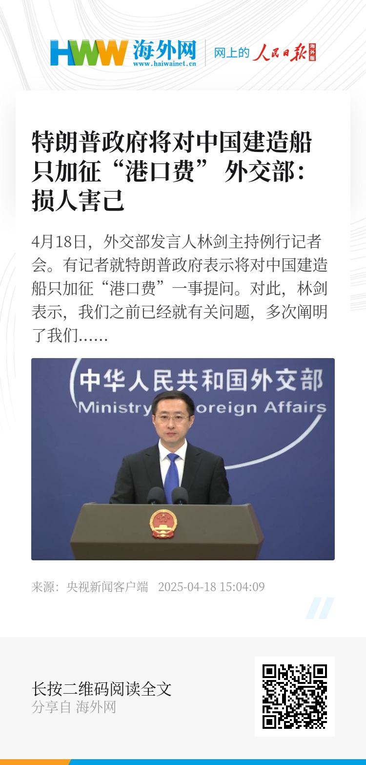 4月18日,外交部发言人林剑主持例行记者会。有记者就特朗普政府表示将对中国建造船只加征“港口费”一事提问。