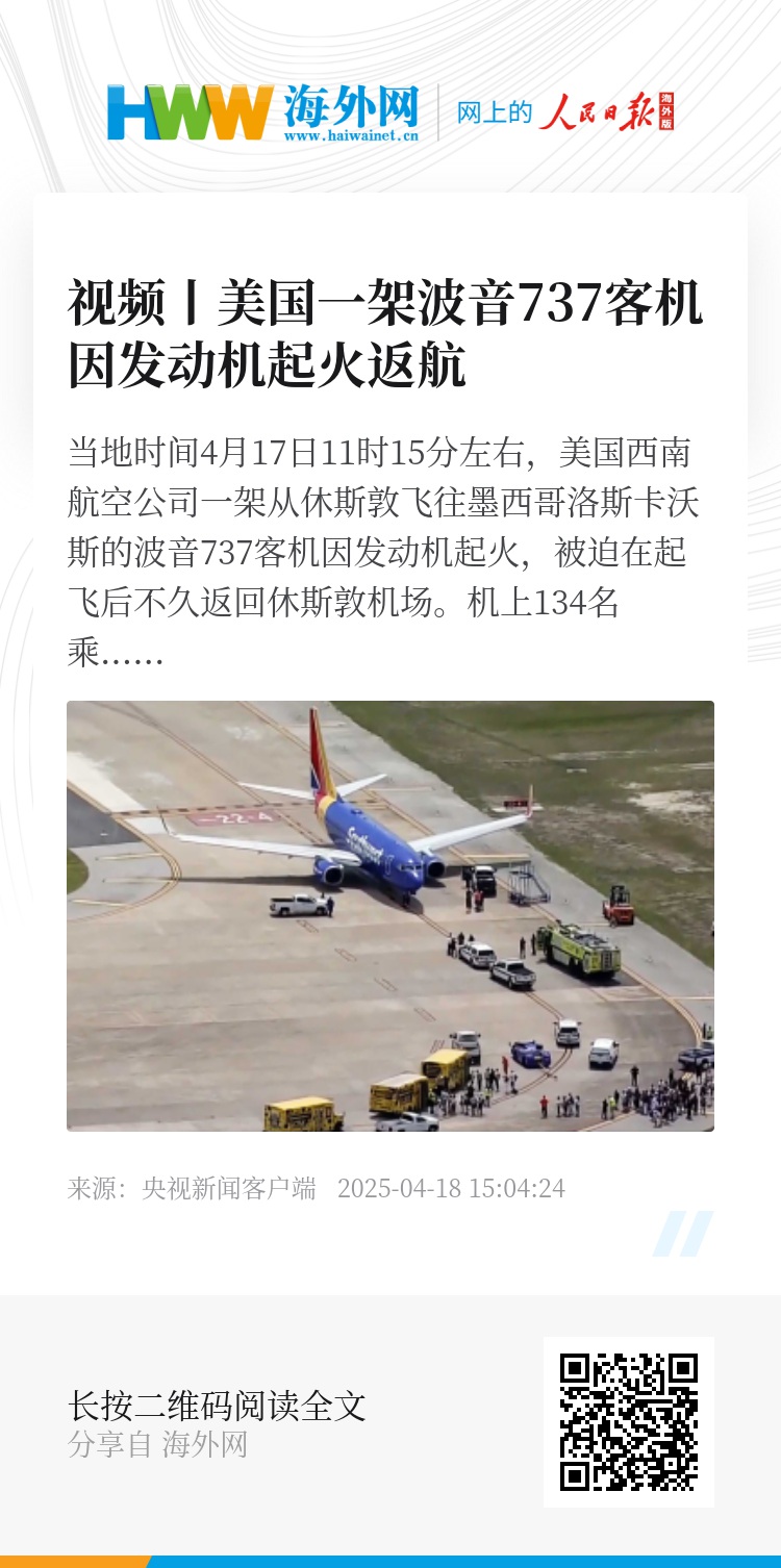 当地时间4月17日11时15分左右,美国西南航空公司一架从休斯敦飞往墨西哥洛斯卡沃斯的波音737客机因发动机起火,被迫在起飞后不久返回休斯敦机场。机上134名乘客撤离。据称这起事件中无人受伤。