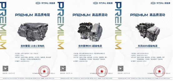 此次共有7款产品凭借卓越的性能表现获得“Premium高品质动力系统”技术验证体系的认可,为行业树立标杆。其中,吉利雷霆11合1双电机获得“Premium高品质电驱”证书;吉利雷神EM-i超级电混、东风800V超级电混获得“Premium高品质混动”证书;东风马赫动力智慧增程、赛力斯超级增程、奇瑞鲲鹏黄金增程、阿维塔昆仑增程获得“Premium高品质增程”证书。