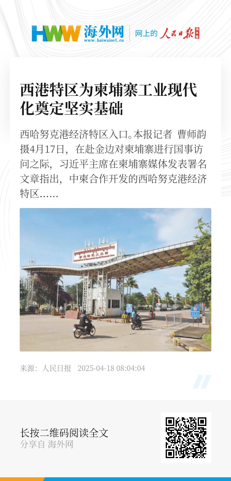 “西港特区不仅推动了柬埔寨产业升级,也带动了技术转移,帮助本地工人掌握先进的生产经验。”柬埔寨21世纪海上丝绸之路研究中心主任涅占达里表示,西港特区为柬埔寨经济注入了新活力,“这是一个经济特区,也是柬埔寨经济腾飞的重要引擎。”