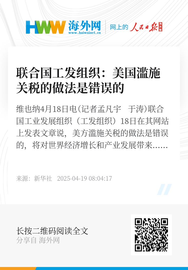 新华社维也纳4月18日电(记者孟凡宇 于涛)联合国工业发展组织(工发组织)18日在其网站上发表文章说,美方滥施关税的做法是错误的,将对世界经济增长和产业发展带来巨大风险,削弱发展中国家和最不发达国家充分参与全球贸易的潜力,抵消这些国家工业现代化和经济多元化努力。