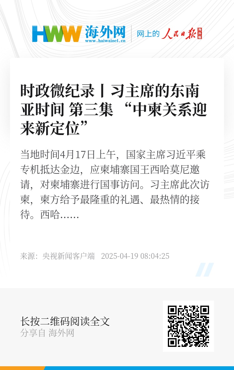 当地时间4月17日上午,国家主席习近平乘专机抵达金边,应柬埔寨国王西哈莫尼邀请,对柬埔寨进行国事访问。