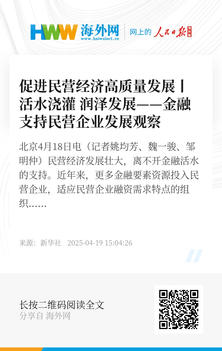 新华社北京4月18日电(记者姚均芳、魏一骏、邹明仲)民营经济发展壮大,离不开金融活水的支持。
