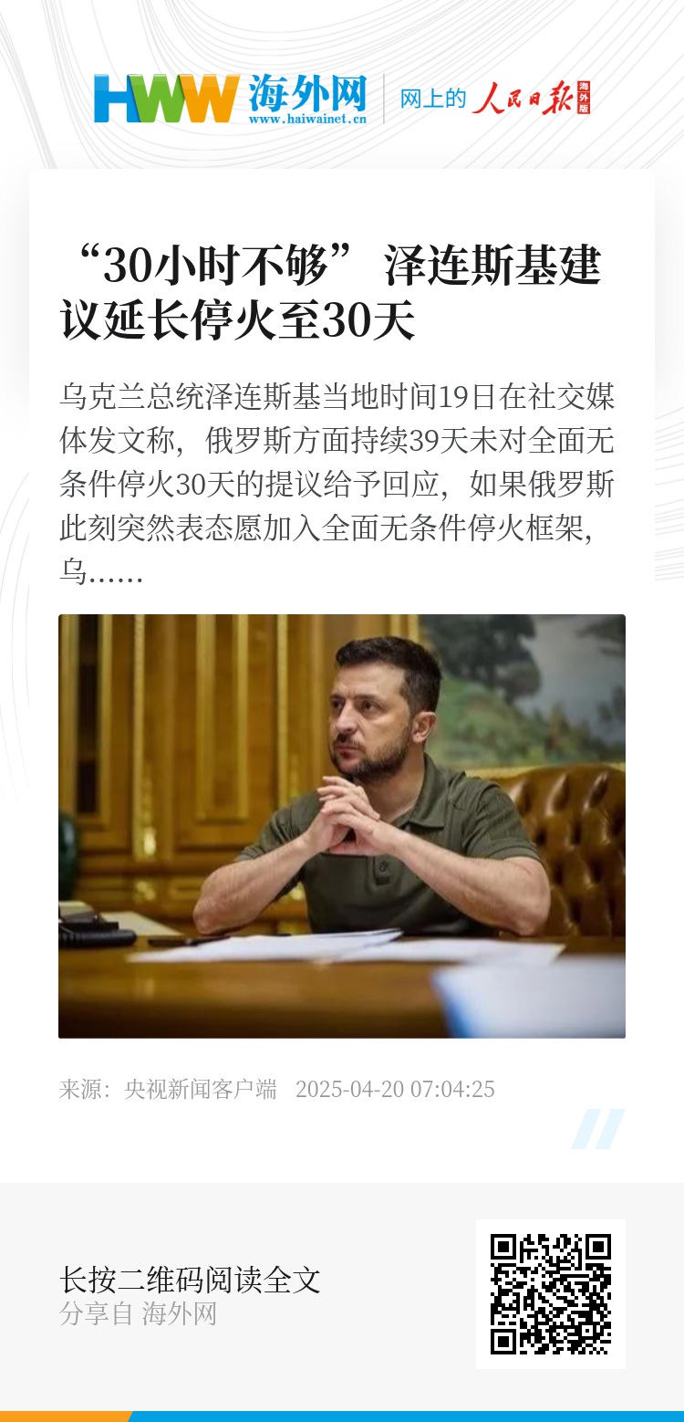 此外,乌克兰总统办公室主任叶尔马克19日晚发布消息称,乌克兰需要俄罗斯进行无条件的全面停火,乌克兰将以静默回应静默,以停火回应停火。叶尔马克认为,若现在真能实现停火,应将停火延续至4月20日之后,俄罗斯应当永久停火以结束冲突。 (总台记者 王斌)