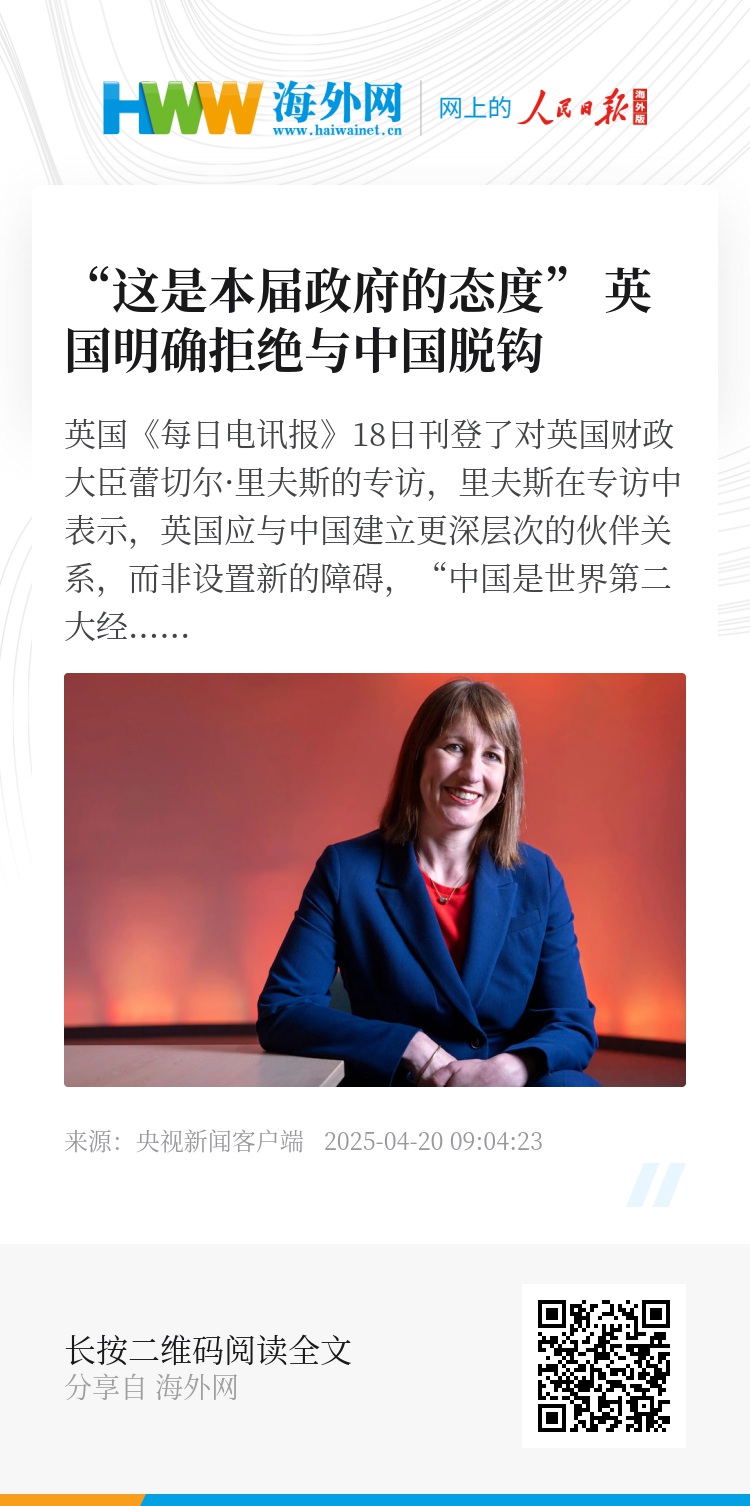 英国《每日电讯报》18日刊登了对英国财政大臣蕾切尔·里夫斯的专访,里夫斯在专访中表示,英国应与中国建立更深层次的伙伴关系,而非设置新的障碍,“中国是世界第二大经济体,我认为不与其接触是非常愚蠢的。这是本届政府的态度。”