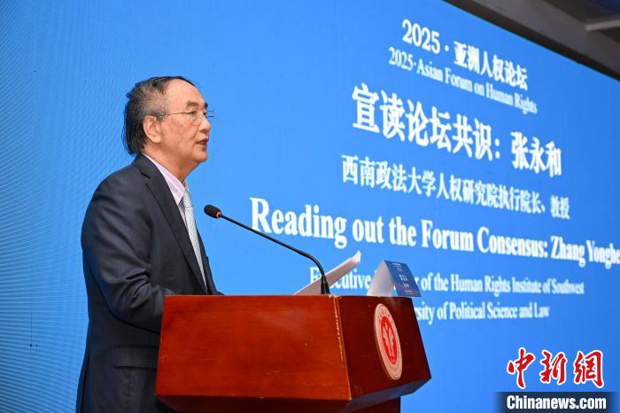 4月20日,2025·亚洲人权论坛在西南政法大学闭幕。图为西南政法大学人权研究院(人权学院)执行院长张永和宣读“亚洲人权论坛”重庆共识。中新社记者 何蓬磊 摄