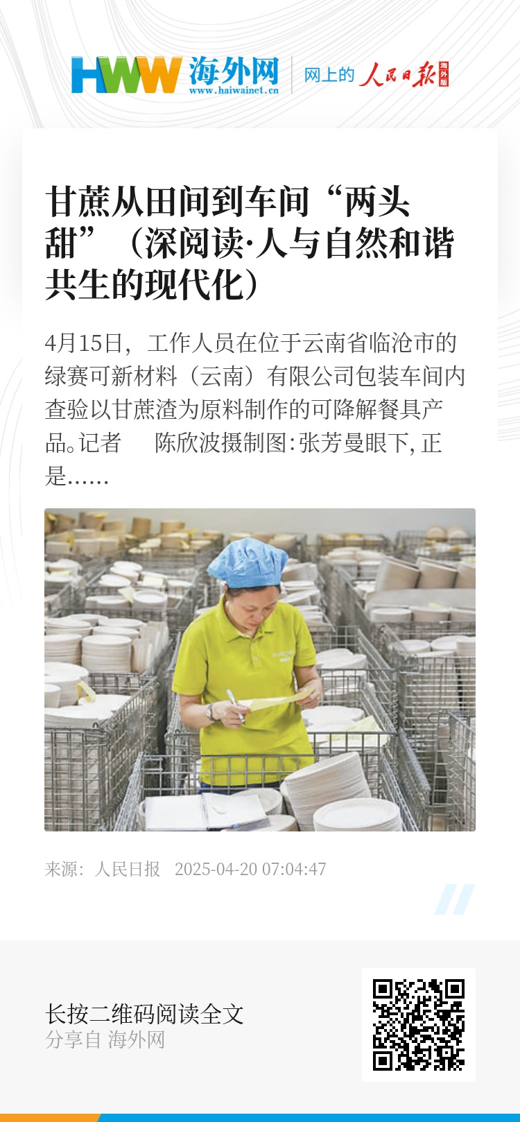 俗话说,甘蔗没有两头甜,然而云南临沧的甘蔗却通过循环利用甜了两头——初榨得糖为“第一甜”,废弃物循环利用、再生为环保餐具等创造“第二甜”,实现了从田间到车间的“两头甜”。
