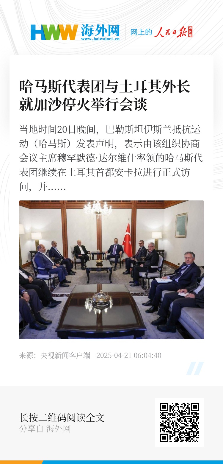 此前,哈马斯代表团还与土耳其国家情报局局长易卜拉欣·卡林举行了会晤。(总台记者 赵兵)