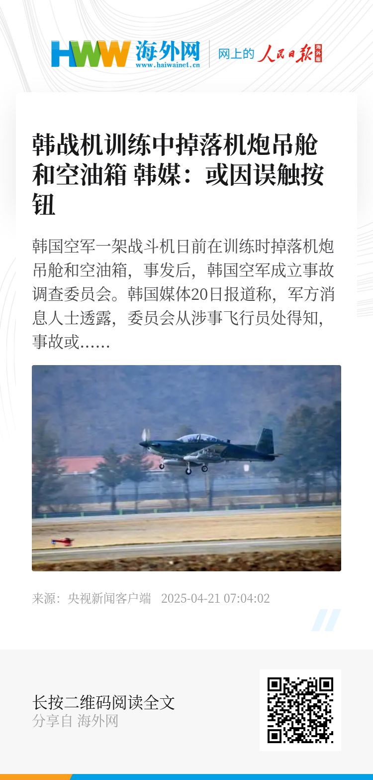 韩国空军一架战斗机日前在训练时掉落机炮吊舱和空油箱,事发后,韩国空军成立事故调查委员会。韩国媒体20日报道称,军方消息人士透露,委员会从涉事飞行员处得知,事故或由误触投放按钮引发。