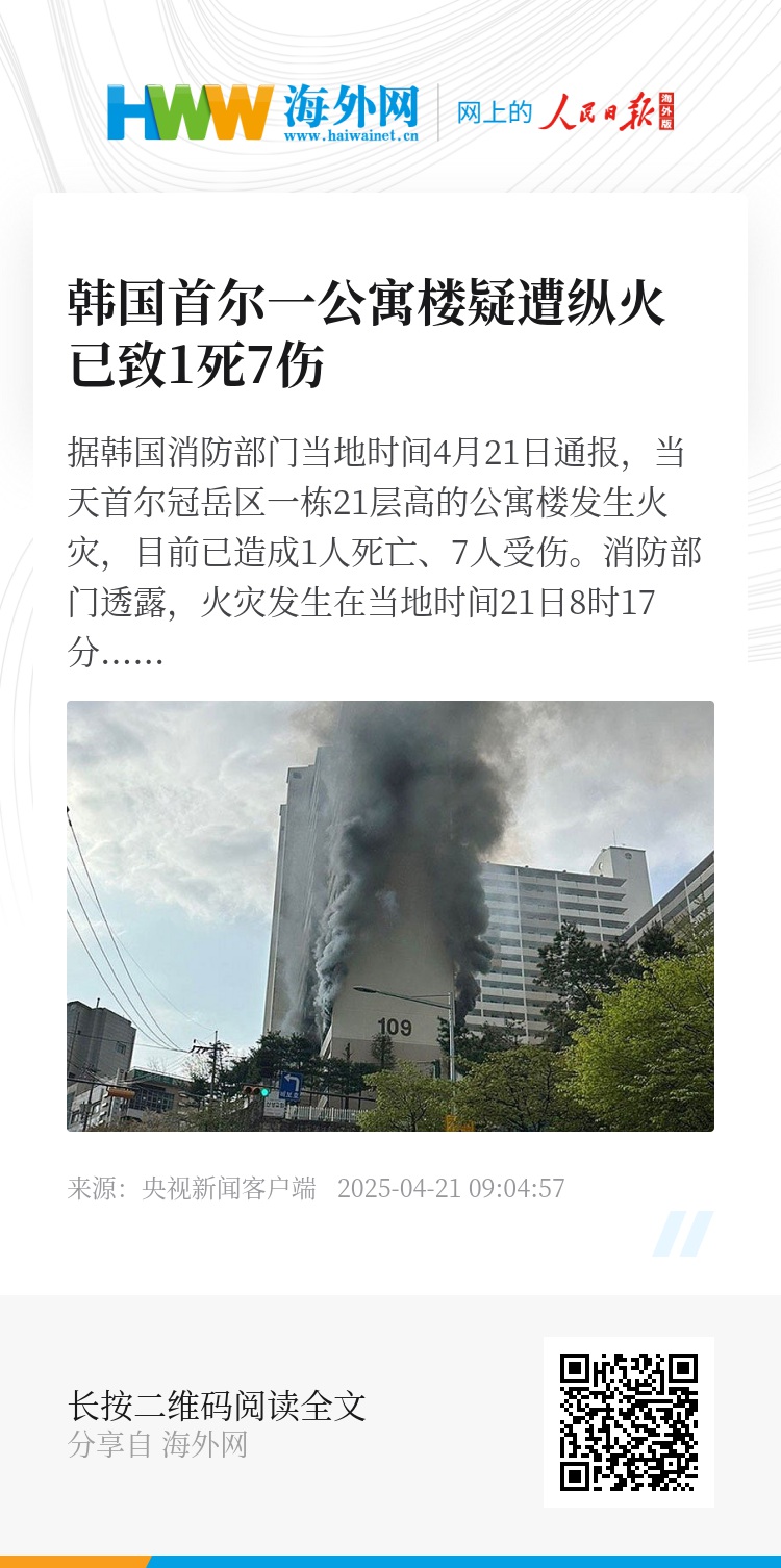 据韩国消防部门当地时间4月21日通报,当天首尔冠岳区一栋21层高的公寓楼发生火灾,目前已造成1人死亡、7人受伤。