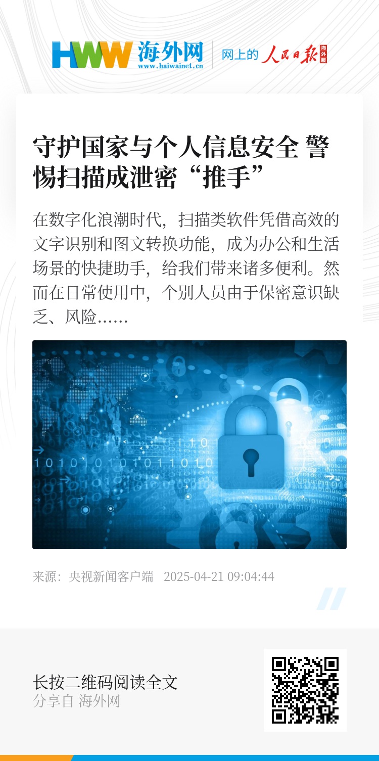 在数字化浪潮时代,扫描类软件凭借高效的文字识别和图文转换功能,成为办公和生活场景的快捷助手,给我们带来诸多便利。然而在日常使用中,个别人员由于保密意识缺乏、风险感知不足,使得这一快捷助手变成了泄露国家秘密、突破保密防线的“推手”。