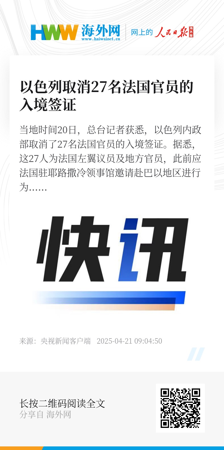 当地时间20日,总台记者获悉,以色列内政部取消了27名法国官员的入境签证。