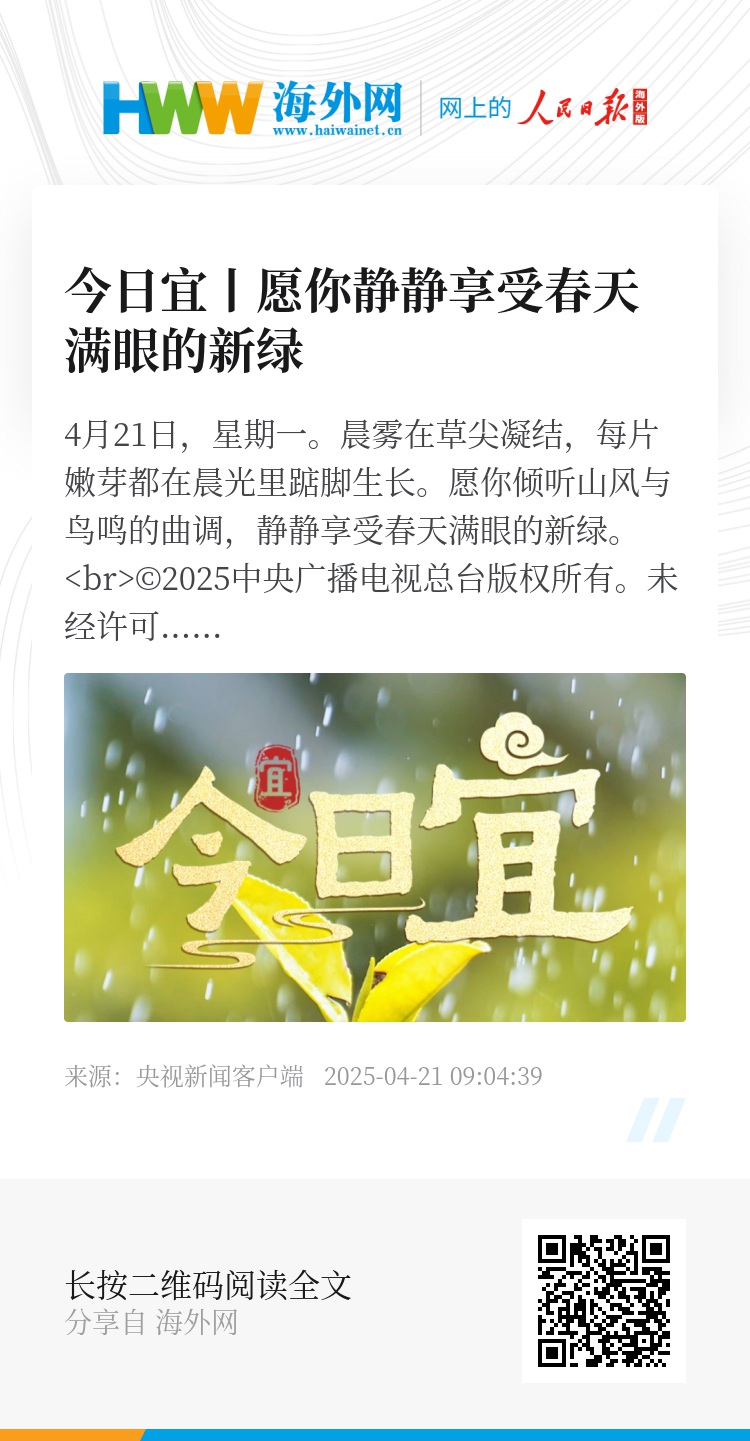 4月21日,星期一。晨雾在草尖凝结,每片嫩芽都在晨光里踮脚生长。愿你倾听山风与鸟鸣的曲调,静静享受春天满眼的新绿。