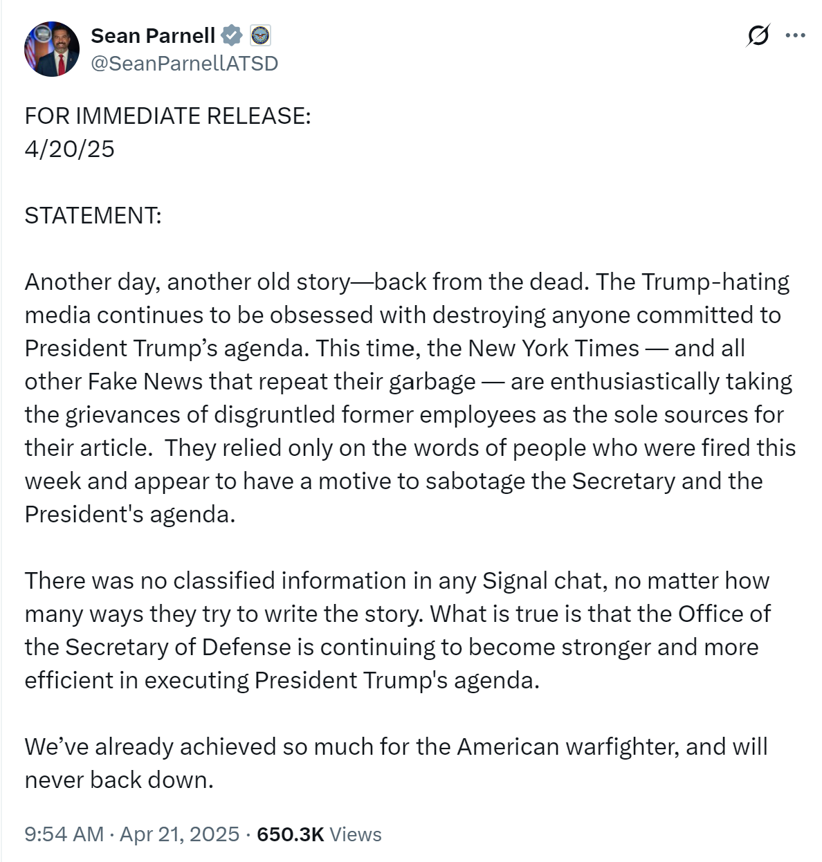 对这一报道,美国国防部发言人肖恩·帕内尔当地时间4月20日在社交平台X上发声明称:“仇视特朗普的媒体继续沉迷于摧毁任何致力于推动特朗普总统议程的人…… 无论他们试图以多少种方式来写这个故事,Signal(信号)聊天中都没有涉及任何机密信息。”