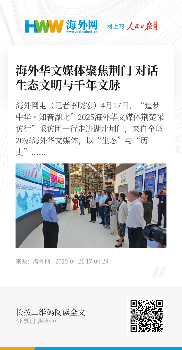海外网电(记者李晓宏)4月17日,“追梦中华・知音湖北”2025海外华文媒体荆楚采访行”采访团一行走进湖北荆门,来自全球20家海外华文媒体,以“生态”与“历史”为经纬,参访荆门市格林美新材料有限公司、荆门市博物馆等地,聚焦湖北荆门如何以生态文明续写千年文脉,用科创动能奏响高质量发展强音。