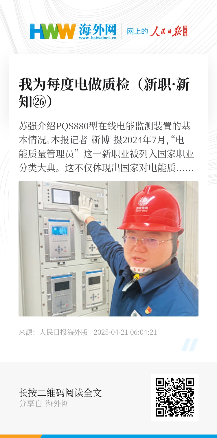 “虽然已经干了好几年,但我和同事们还是有‘本领恐慌’。因为这个岗位是‘一专多能’,电力系统运行的各个环节都需要我们深度参与,对电力工程、数据分析、设备运维、现场施工甚至居民家用电器和企业生产设备都得有所了解。”苏强表示,电能质量管理员直接服务于节能减排,助力用户减少能源浪费,这也是人社部将这一职业定义为“绿色职业”的原因,“不光可以显著提高电力系统的运行效率,降低能源损耗,还可以服务充电基础设施、储能系统,在推动绿色低碳转型方面发挥重要作用。”(记者 靳博)