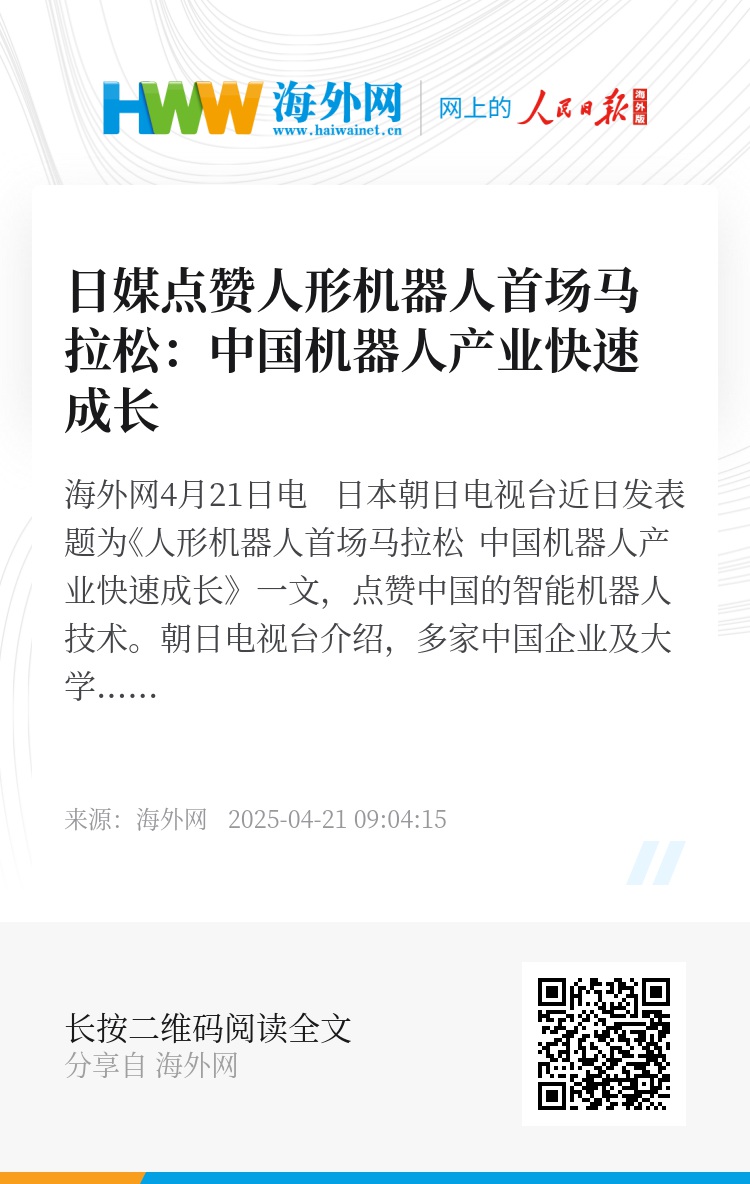 海外网4月21日电 日本朝日电视台近日发表题为《人形机器人首场马拉松 中国机器人产业快速成长》一文,点赞中国的智能机器人技术。